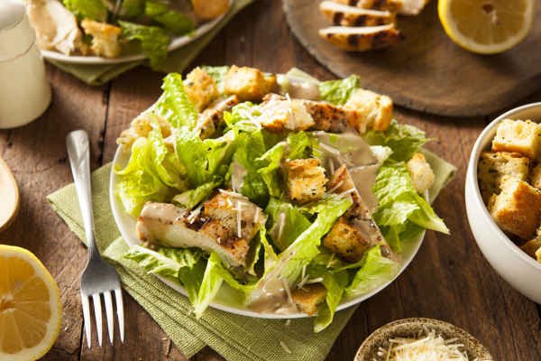 Freshly chopped romaine lettuce tossed with caesar dressing and topped with croutons and juicy grilled chicken.