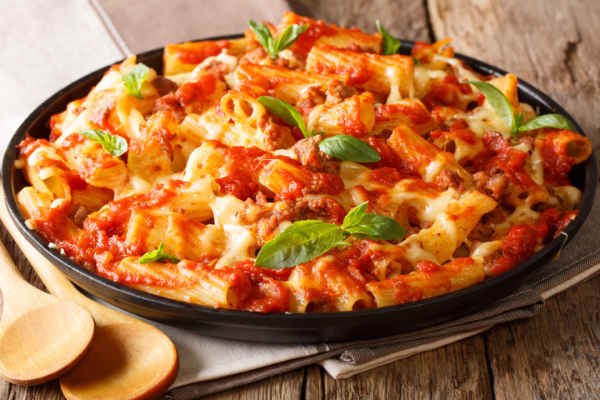 A tray of baked ziti layered with ricotta, mozzarella and meat sauce, served hot.